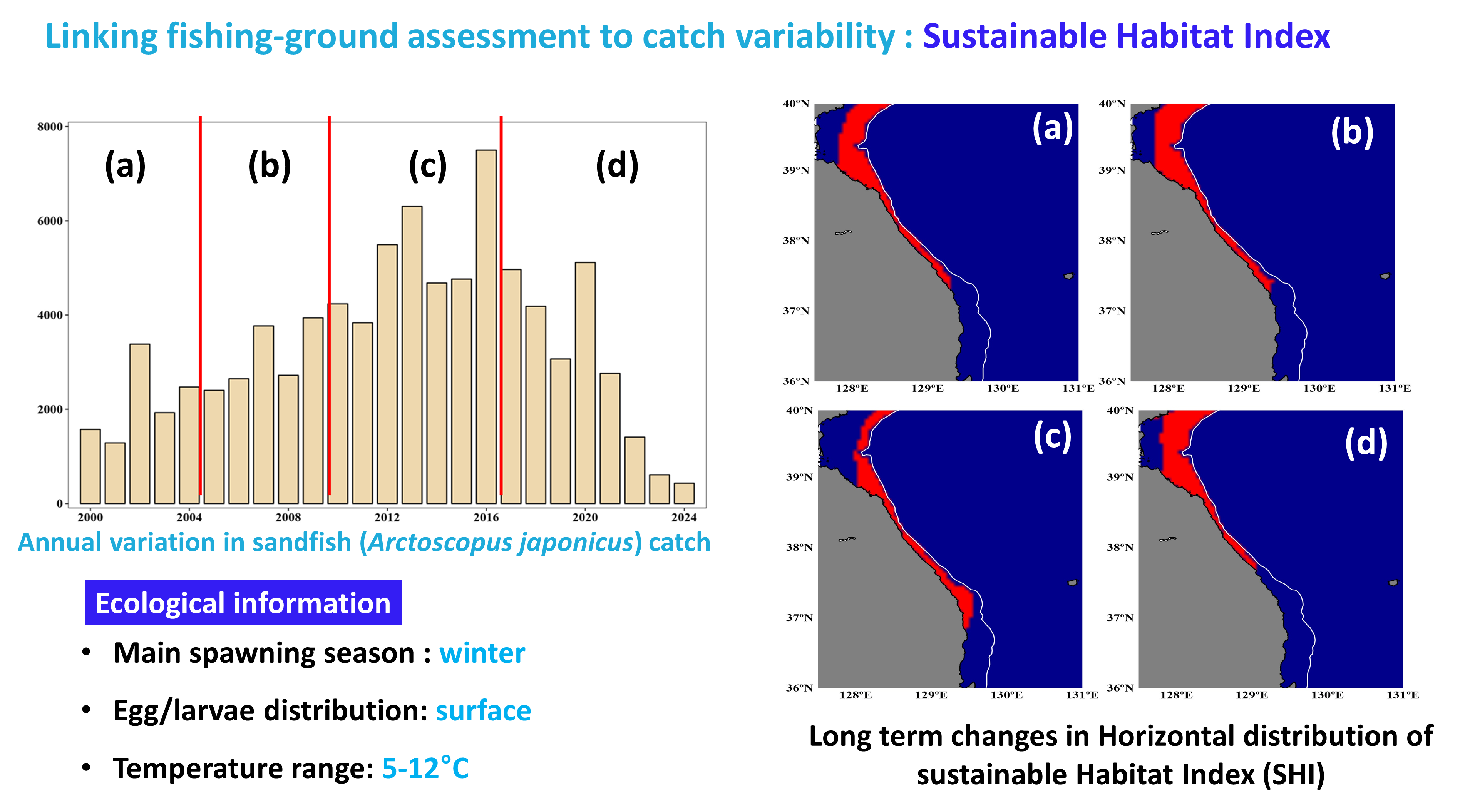 실험실 소개 생명과학2호관 219호 현장관측 자료를 기반으로 동해 해양환경 변화와 수산자원 생태 변동을 정량 분석하고, 어장 생산성 평가와 자원관리 예측모형을 개발하는 연구실입니다. 연구분야 수산자원생물 어장의 공간적 위치 변화 및 자원량 변동 원인 구명